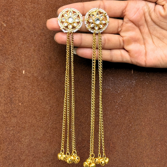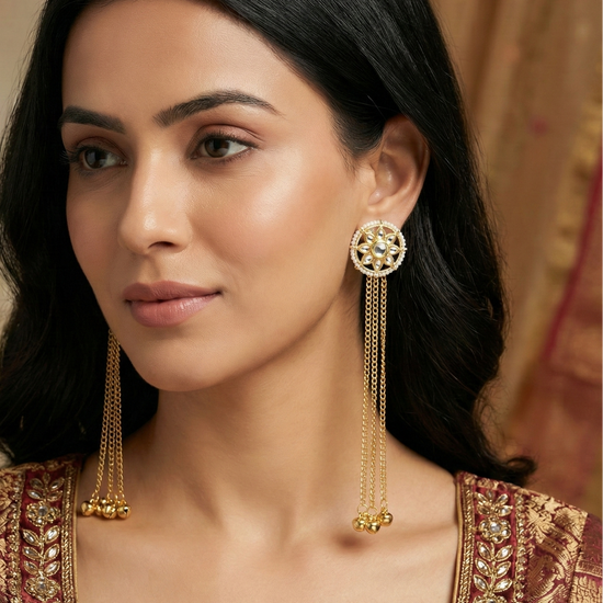 Long gold-toned chain tassels finished with tiny ghungroo-style drops create a beautiful sway, making these earrings perfect for adding drama without feeling heavy. Lightweight and versatile, they bring elegance to every outfit.