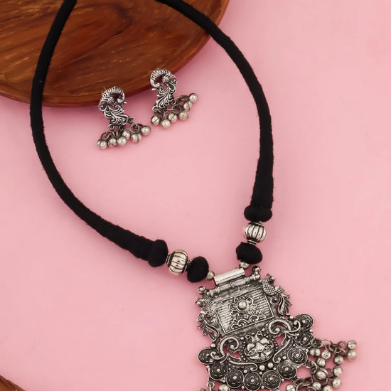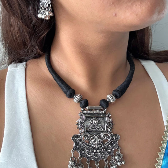 A statement of heritage and grace, the Anita Choker Set blends intricate craftsmanship with timeless elegance. The oxidised silver choker features a richly detailed central pendant adorned with traditional motifs and cascading ghungroo drops, strung on a soft black thread for a classic tribal finish. Paired with matching earrings and a beautifully crafted finger ring highlighted with pearl detailing and a subtle pop of red, this set is designed to make an impression.