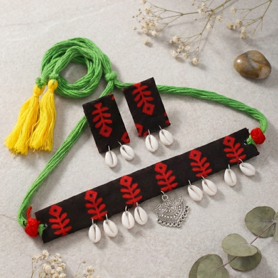 Rooted in tradition, the Bansi Ajrakh Choker Set pairs tribal red motifs with playful cowrie shells and oxidized charm. A bold blend of craft and culture, perfect for boho souls.