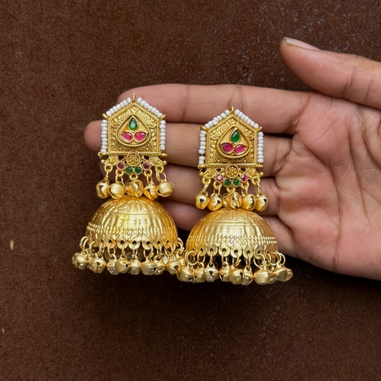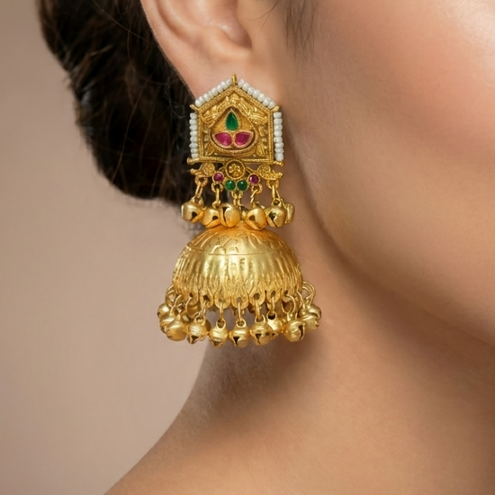 Style It With: Pair this bold jhumka with silk sarees, Kanjeevaram drapes, Banarasi suits, or ornate lehengas for an effortlessly majestic appeal. It beautifully complements bridal outfits, festive ensembles, and traditional attire for haldi, sangeet, pooja ceremonies, or receptions. Wear it with a sleek bun or soft waves to highlight its detailed craftsmanship and let it be the centrepiece of your look.