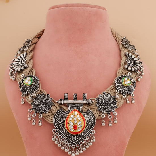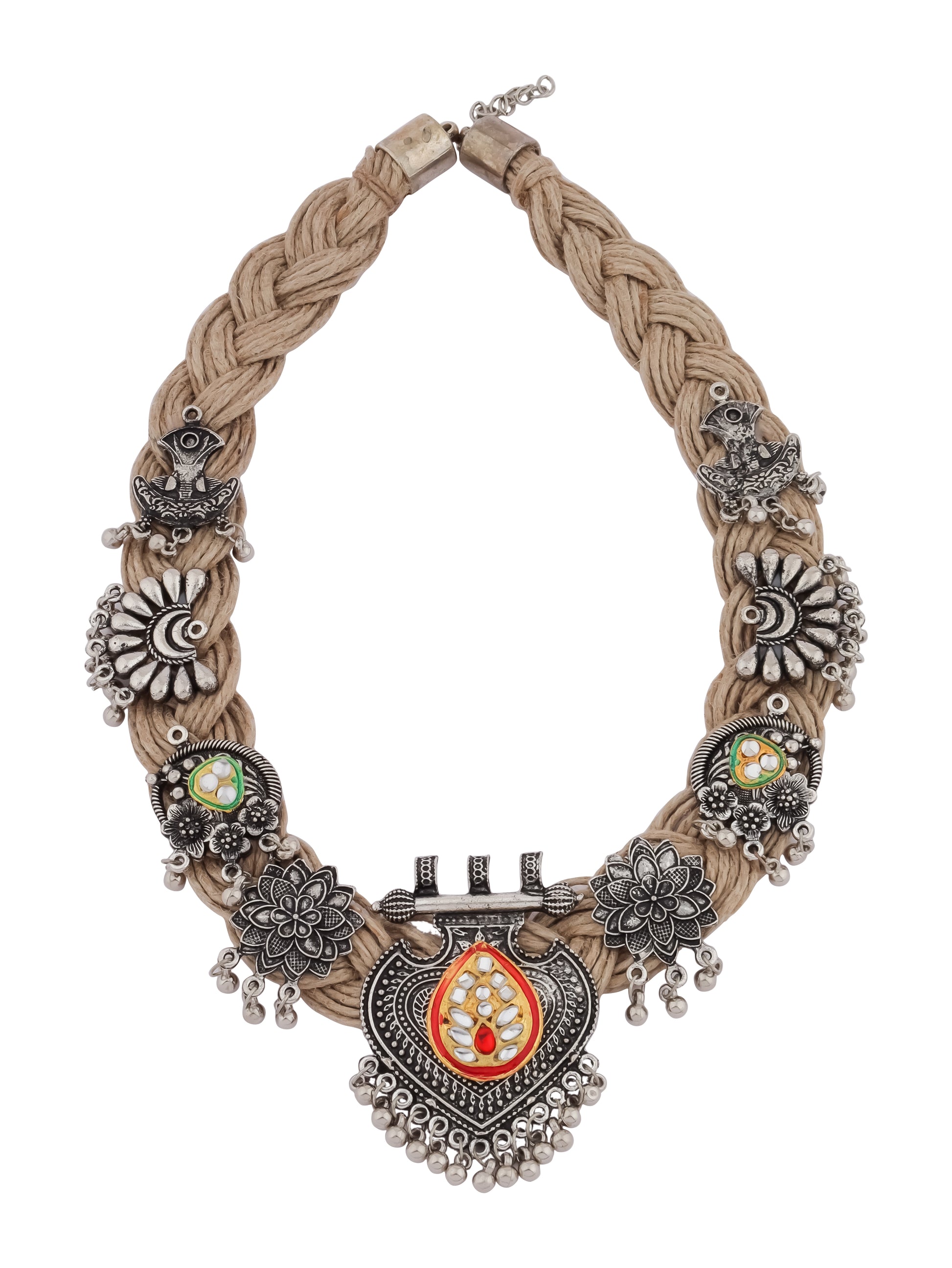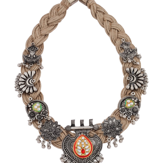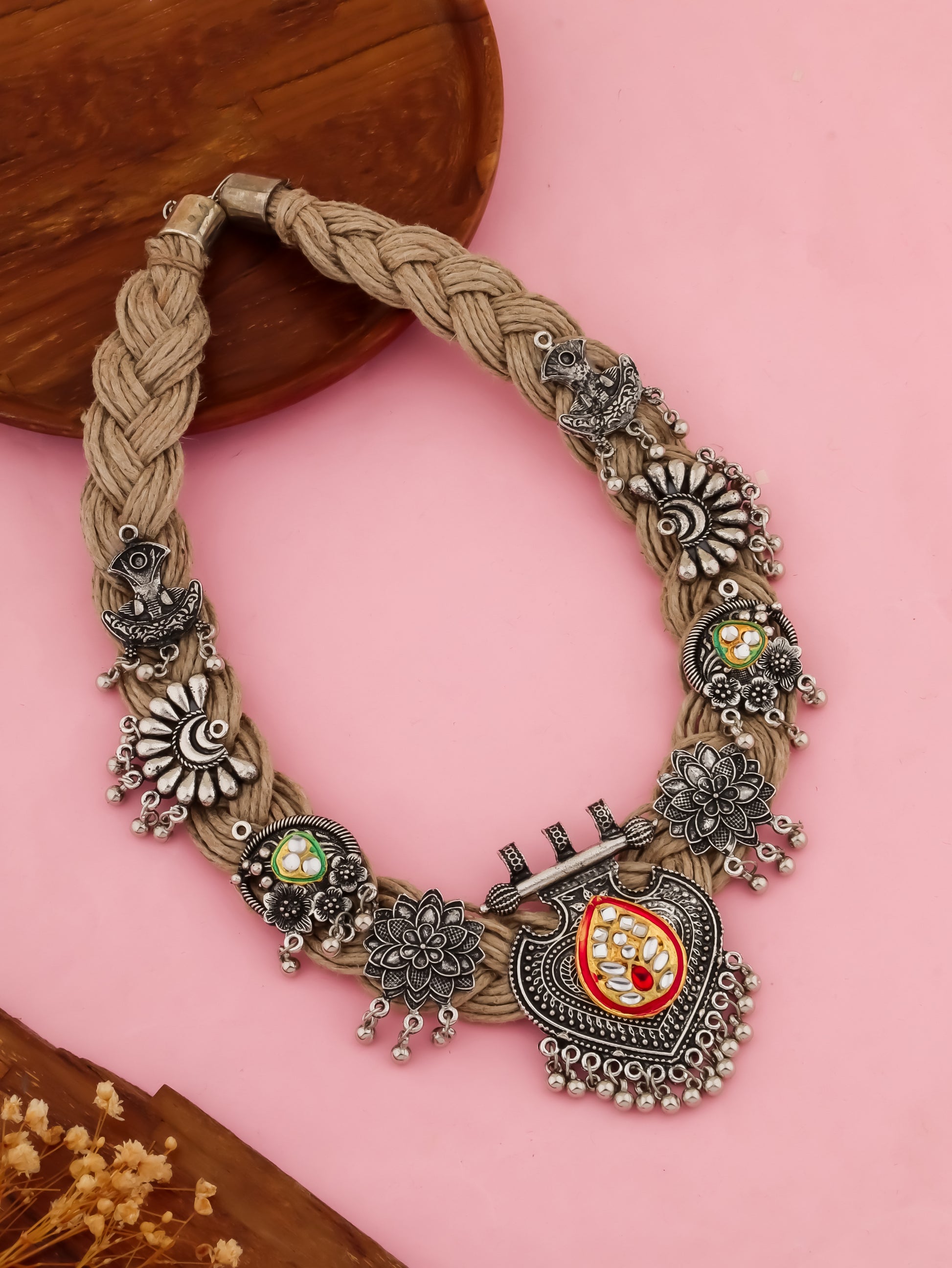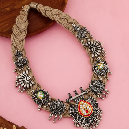 Celebrate the charm of traditional craftsmanship with the Chetna Beige Jute Necklace. Made from eco-friendly beige jute, this necklace is adorned with beautiful Indian motifs that exude cultural elegance. The earthy texture of the jute pairs seamlessly with the intricate design, making this necklace a perfect accessory for ethnic and fusion outfits alike.