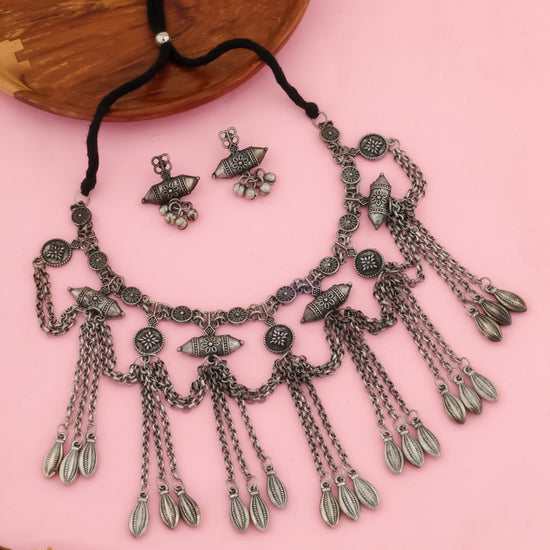 Dipali Kutchi Oxidised Choker Set is a masterpiece. Oxidised, lightweight and beautiful choker with dangling charms comes with earrings.