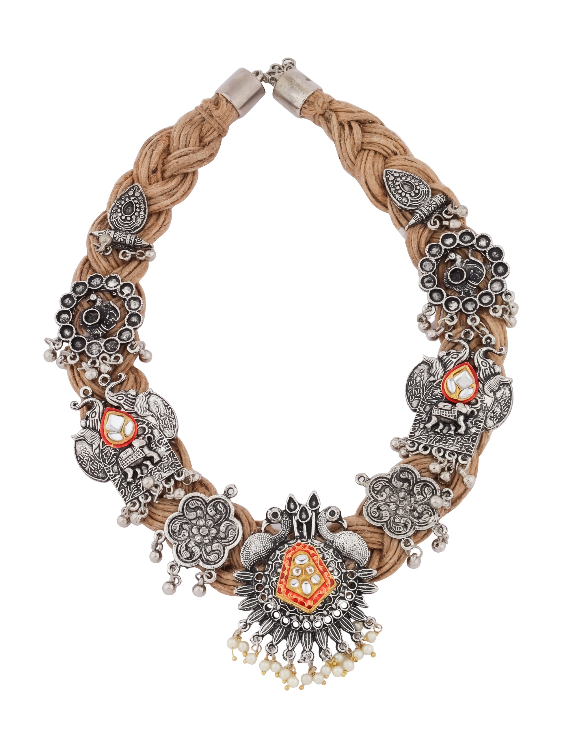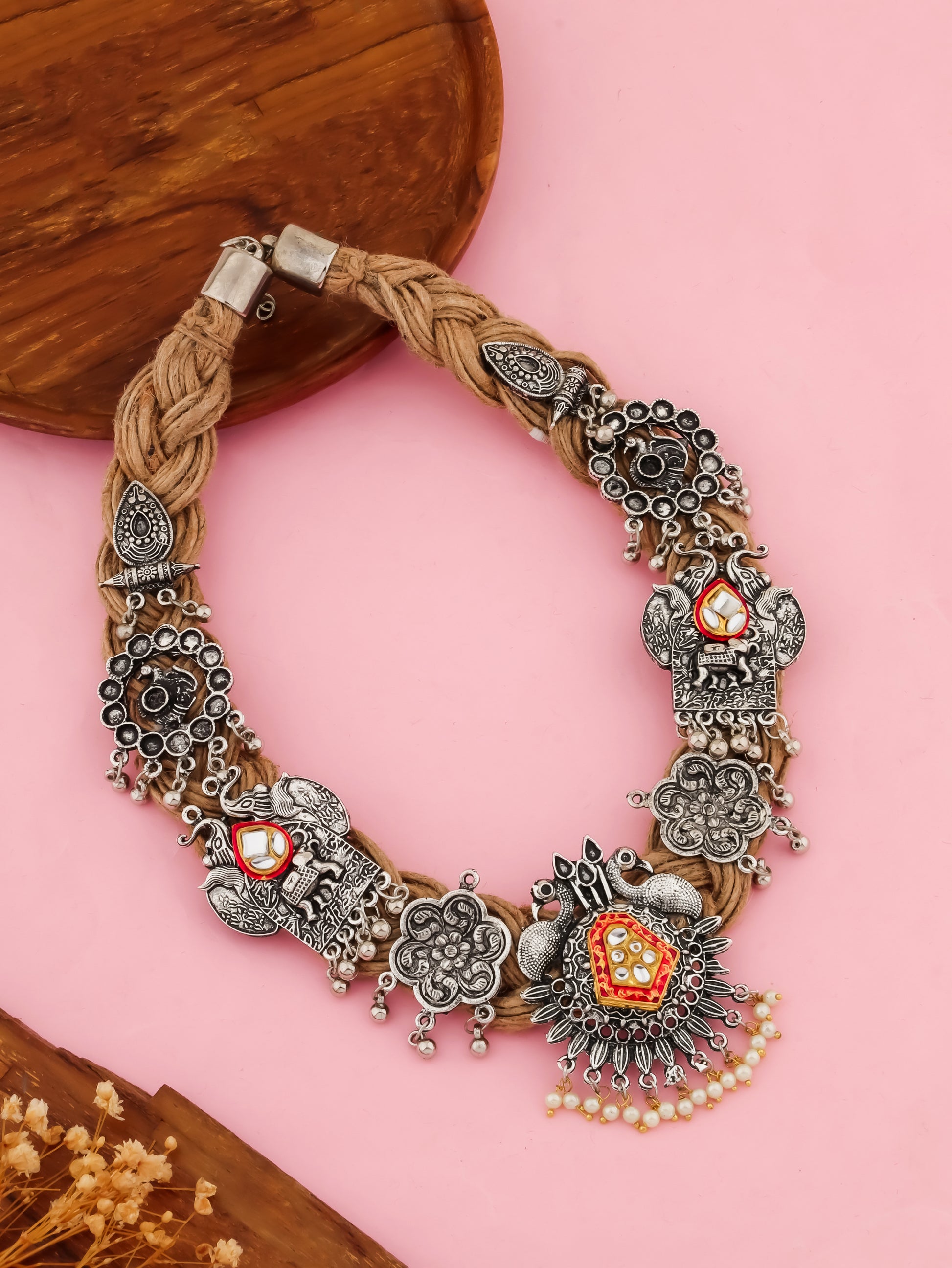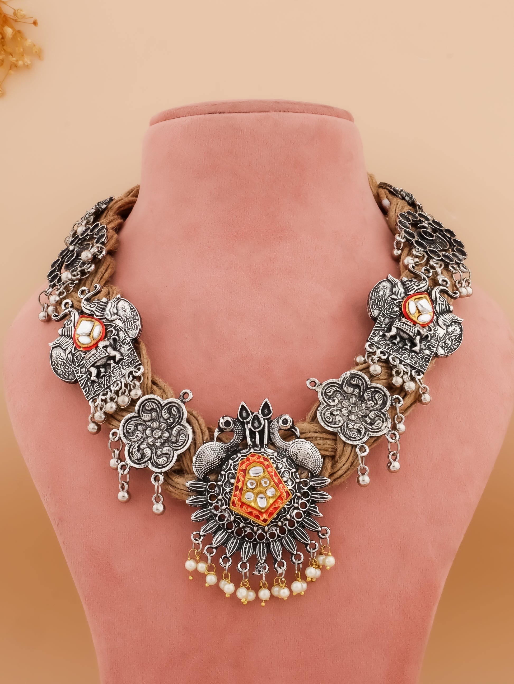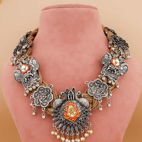 Celebrate the charm of traditional craftsmanship with the Gauri Beige Jute Necklace. Made from eco-friendly beige jute, this necklace is adorned with beautiful Indian motifs that exude cultural elegance. The earthy texture of the jute pairs seamlessly with the intricate design, making this necklace a perfect accessory for ethnic and fusion outfits alike.