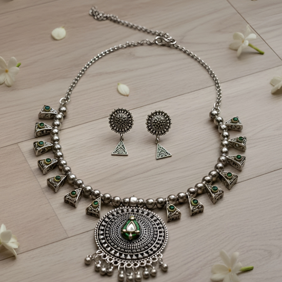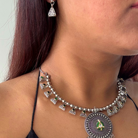 Traditionally inspired yet effortlessly modern, this set pairs just as beautifully with sarees and lehengas as it does with solid co-ord sets, monochrome dresses, crisp shirts, or deep-neck blouses. Style it with earthy tones, blacks, whites, or jewel shades to let the oxidised silver detailing truly shine.