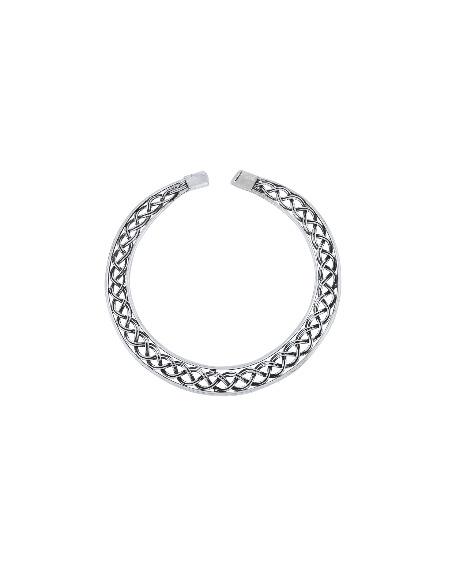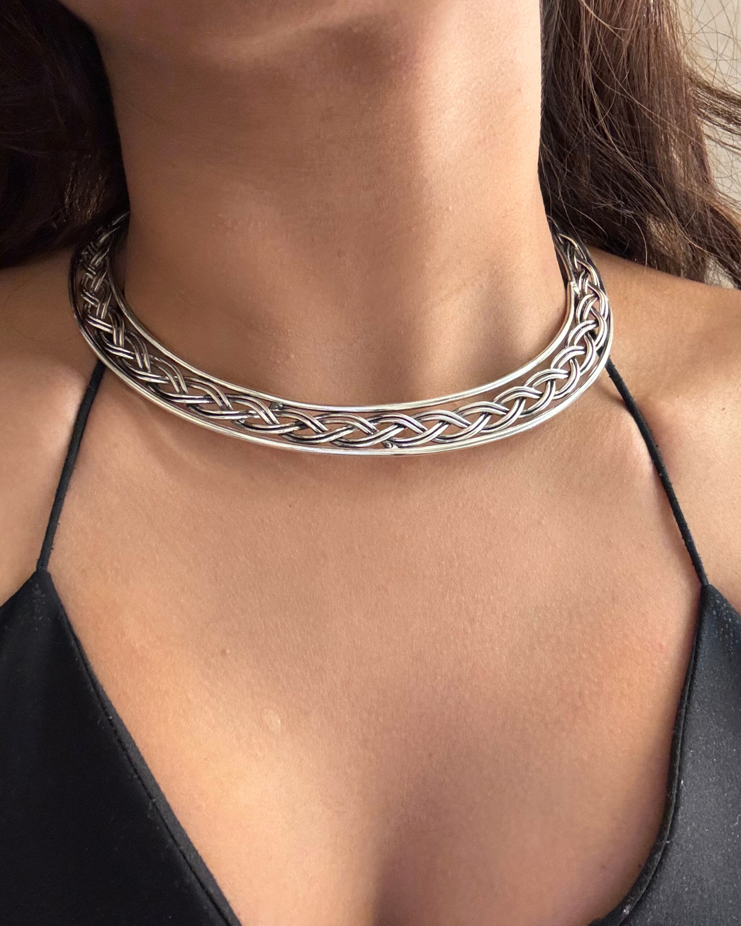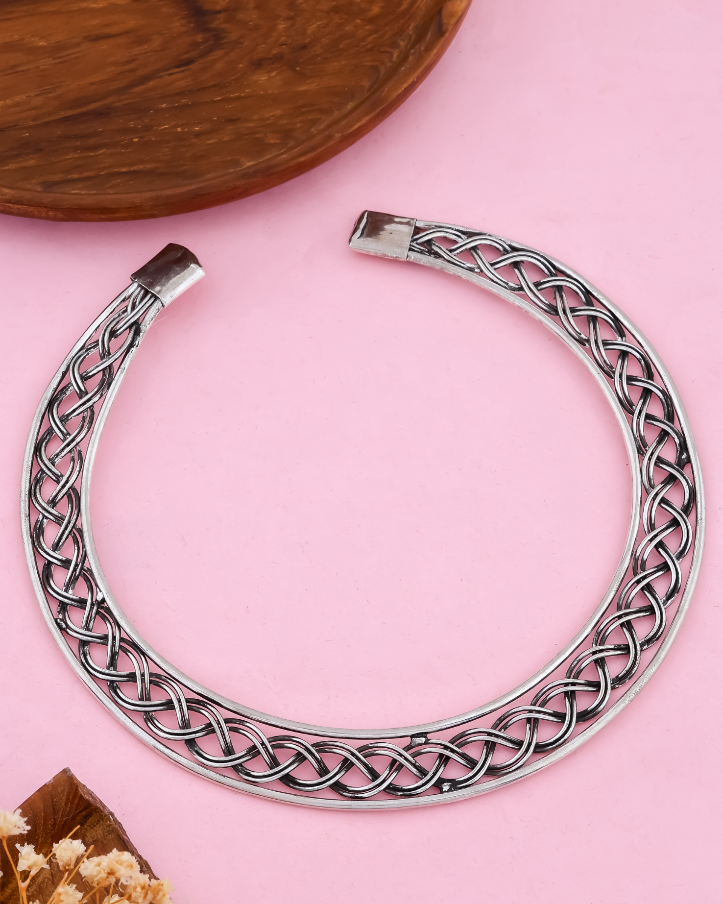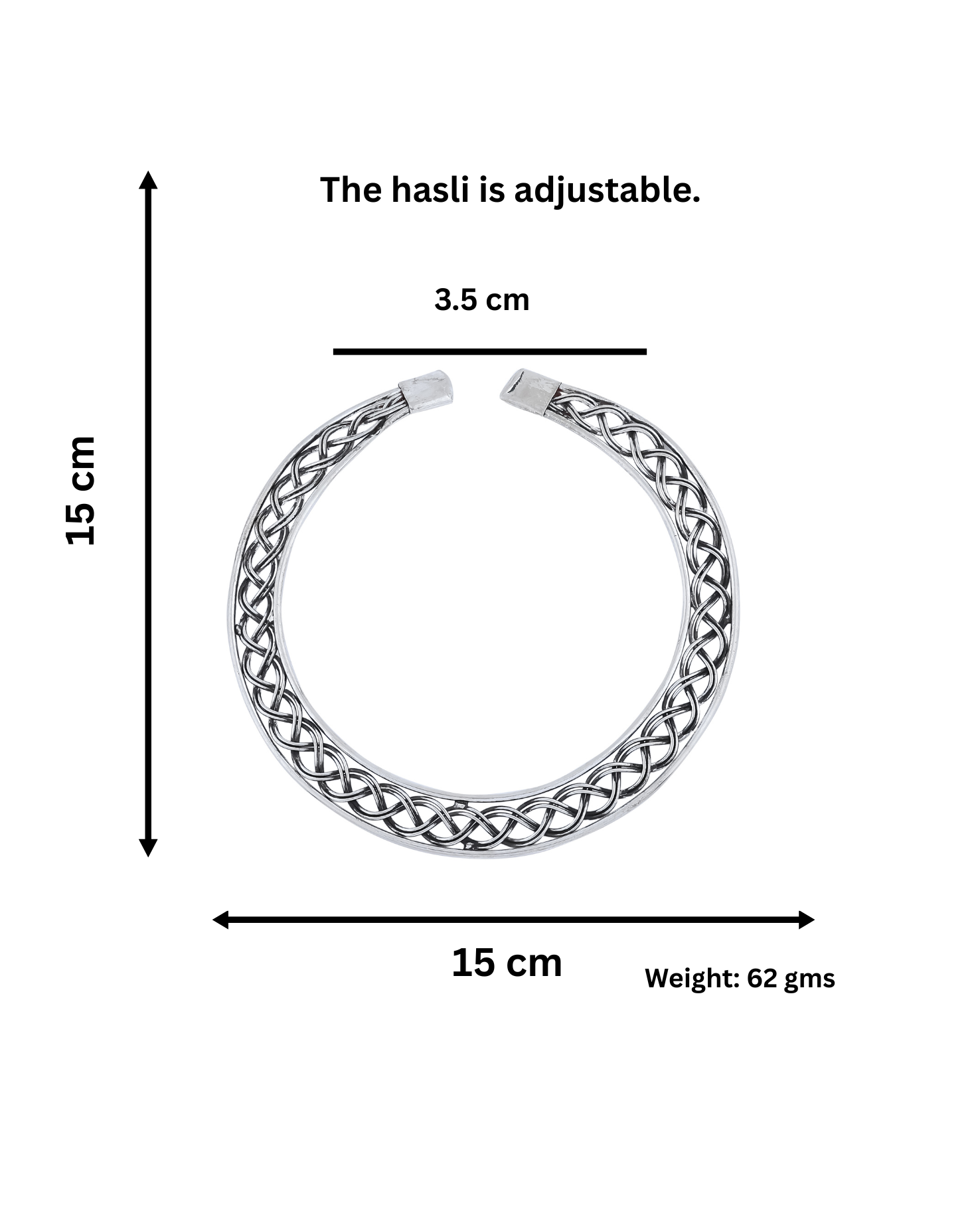 Karishma Silver Hasli: Knotted design, minimalist yet bold.