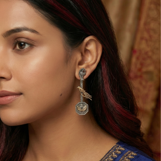 Elegant and eye-catching, the Mithu Earrings feature a graceful dual-tone finish with intricate detailing. Their long silhouette adds a touch of sophistication - perfect to elevate both festive and everyday ethnic looks with effortless charm.