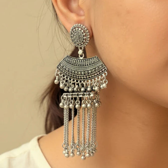 Rooted in traditional charm with a bold statement appeal, the Nadia Combo pairs intricately crafted elephant-motif bangles with striking long oxidised jhumkas. The set includes two oxidised bangles adorned with detailed elephant accents, symbolising grace and strength, complemented by dramatic chandelier-style jhumkas featuring layered detailing and delicate dangling elements.