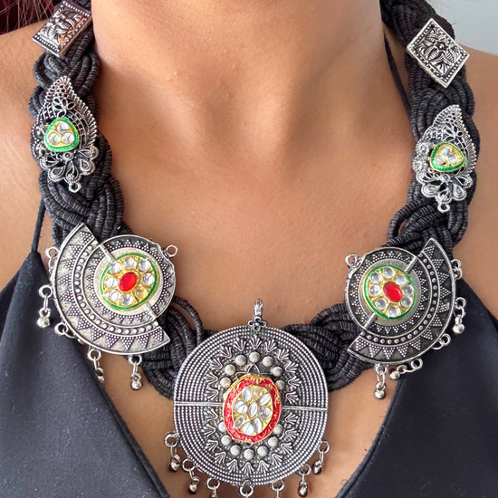 Celebrate the charm of traditional craftsmanship with the Naintara Black Jute Necklace. Made from eco-friendly black jute, this necklace is adorned with beautiful Indian motifs that exude cultural elegance. The earthy texture of the jute pairs seamlessly with the intricate design, making this necklace a perfect accessory for ethnic and fusion outfits alike.