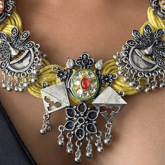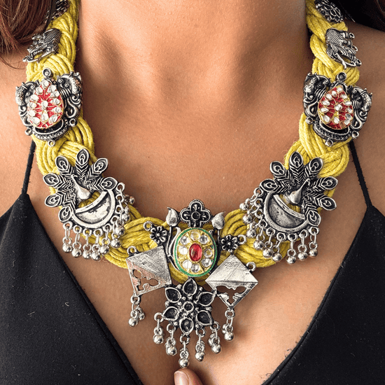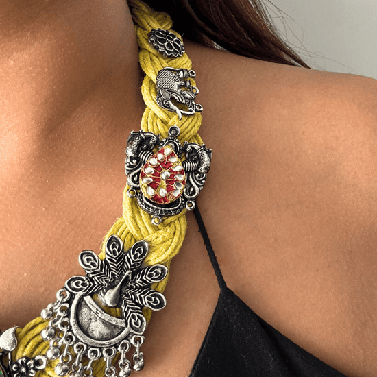 Celebrate the charm of traditional craftsmanship with the Patang Yellow Jute Necklace. Made from eco-friendly bright yellow jute, this necklace is adorned with beautiful Indian motifs that exude cultural elegance. The earthy texture of the jute pairs seamlessly with the intricate design, making this necklace a perfect accessory for ethnic and fusion outfits alike. Adorned with oxidised Kite, Peacock, Elephants and Afghan motifs, it's a masterpiece!