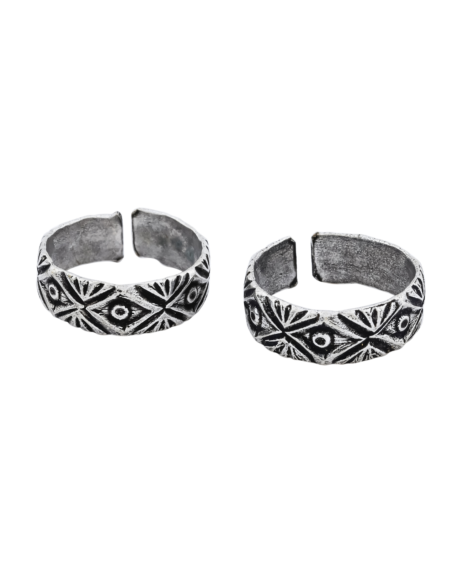 Featuring intricate tribal patterns, this oxidized silver toe ring set celebrates timeless tradition and feminine grace.