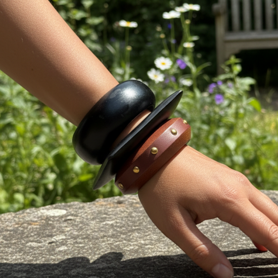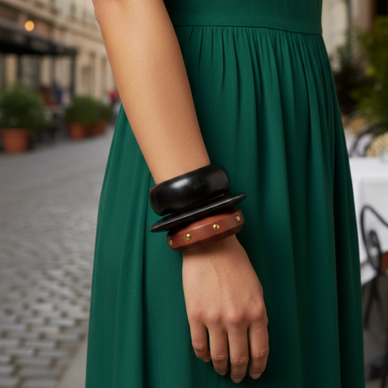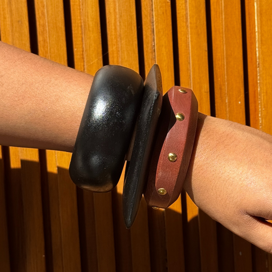 Inspired by rich earth tones and modern minimalism, the Rust Muse Wooden Bangle Stack is designed for effortless statement styling. This set of three features a chunky matte black bangle, a sleek black flat bangle, and a rust-brown wooden bangle accented with subtle metal studs - creating a perfect balance of texture, tone, and contrast.
