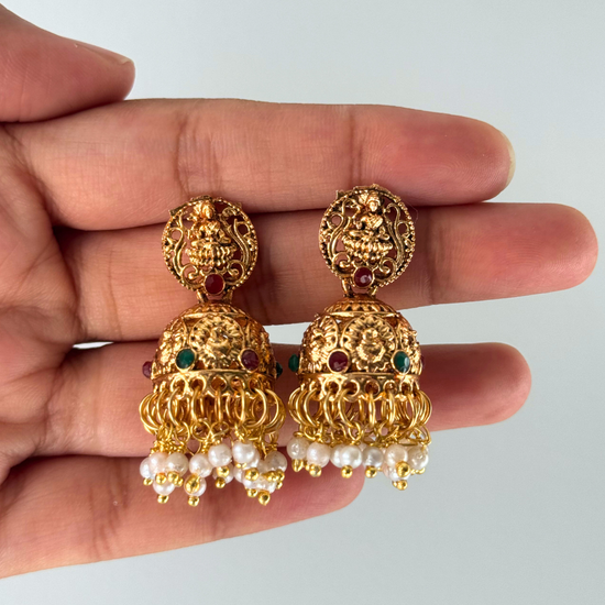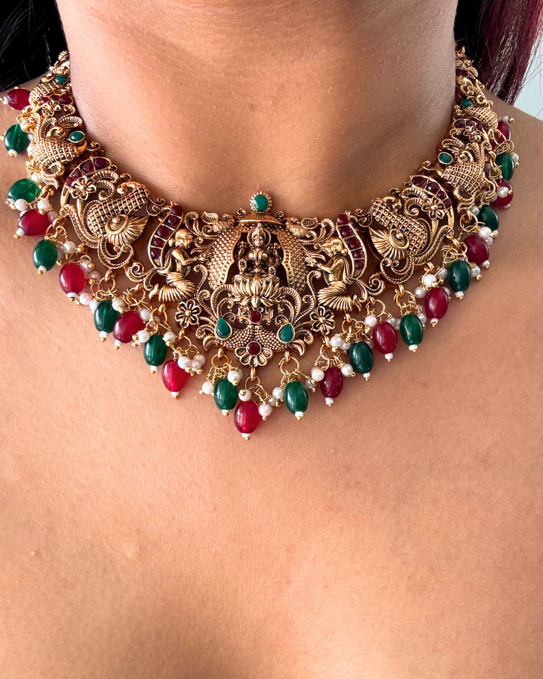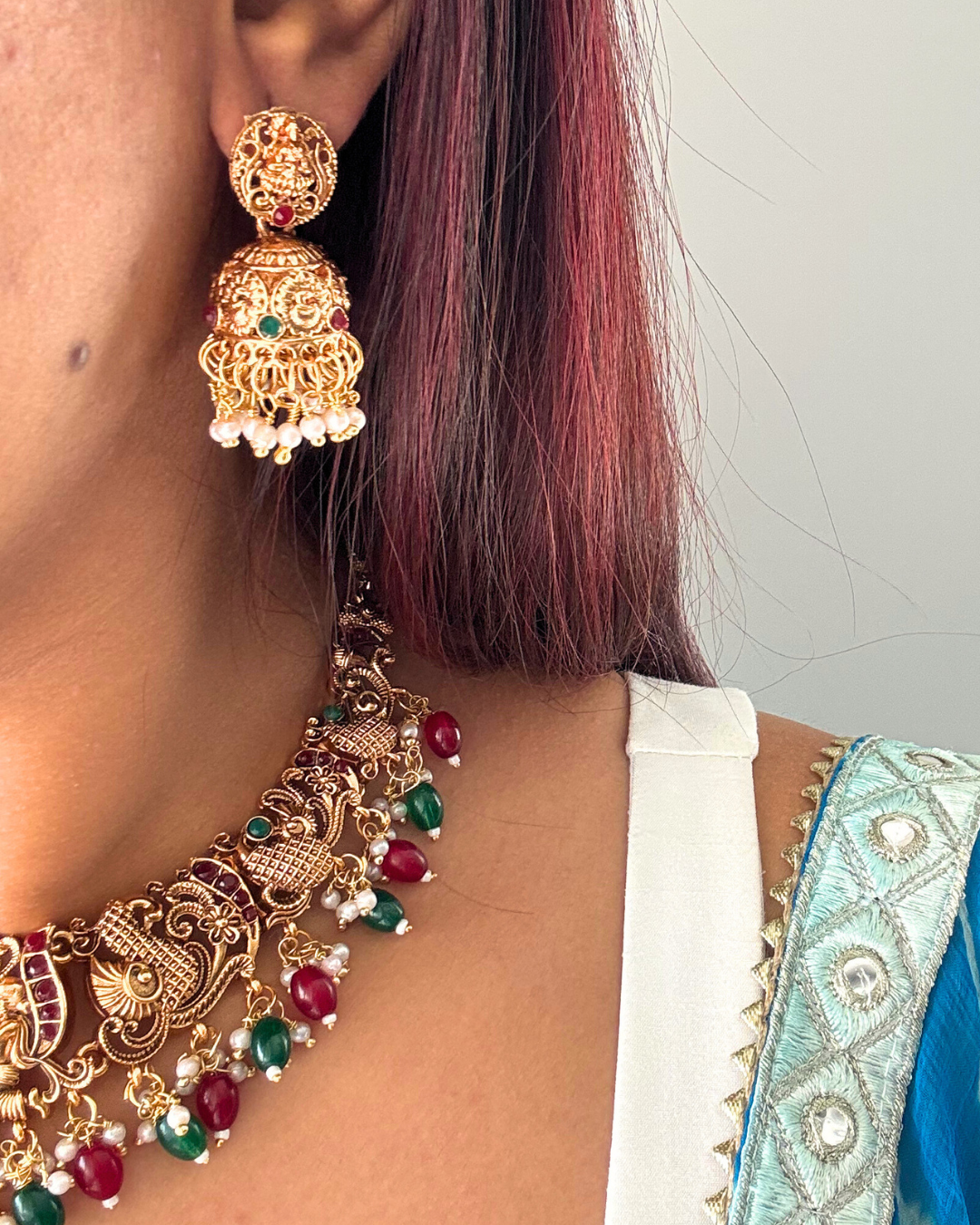Features: Antique gold finish, premium ruby and emerald stones, handcrafted deity motifs, comes with matching jhumka earrings