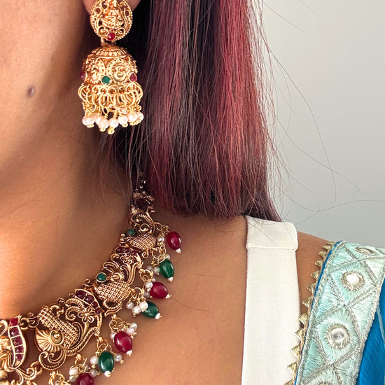The Saraswati Temple Necklace Set is an opulent tribute to South Indian artistry, featuring an intricately carved Goddess Saraswati motif at its center. Adorned with ruby and emerald stones, pearl accents, and antique gold detailing, this statement necklace radiates divine grace. The matching jhumka earrings complete the regal look, perfect for grand occasions.