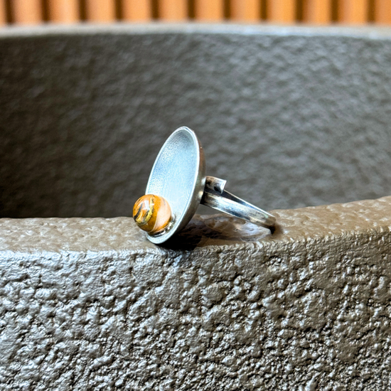 The Seep Adjustable Ring is a contemporary imitation silver piece inspired by organic shell forms. Its concave dome design features a smooth metallic finish and a single amber-toned stone accent that adds a warm, earthy contrast. The ring is adjustable.