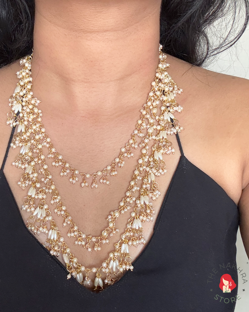 Exude timeless elegance with the Soni Long Pearl Necklace, a sophisticated piece crafted with luminous pearls and designed for graceful versatility. Wear it as a beautiful head jewellery, kamarbandh and necklace and oh my, shine!! This long necklace embodies classic beauty, perfect for enhancing both traditional and contemporary ensembles.