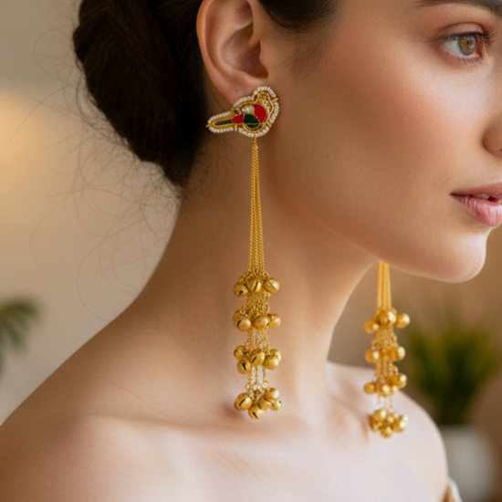 Elevate your festive charm with the Sunehri Pakhi Long Golden Kashmiri Jhumka. Designed with intricate Kashmiri craftsmanship, this statement pair features a beautifully detailed stud highlighted with red and green accents, cascading into long golden tassels adorned with traditional jingling beads. Lightweight yet luxurious, these earrings add a touch of elegance and regal shine to every ethnic look.