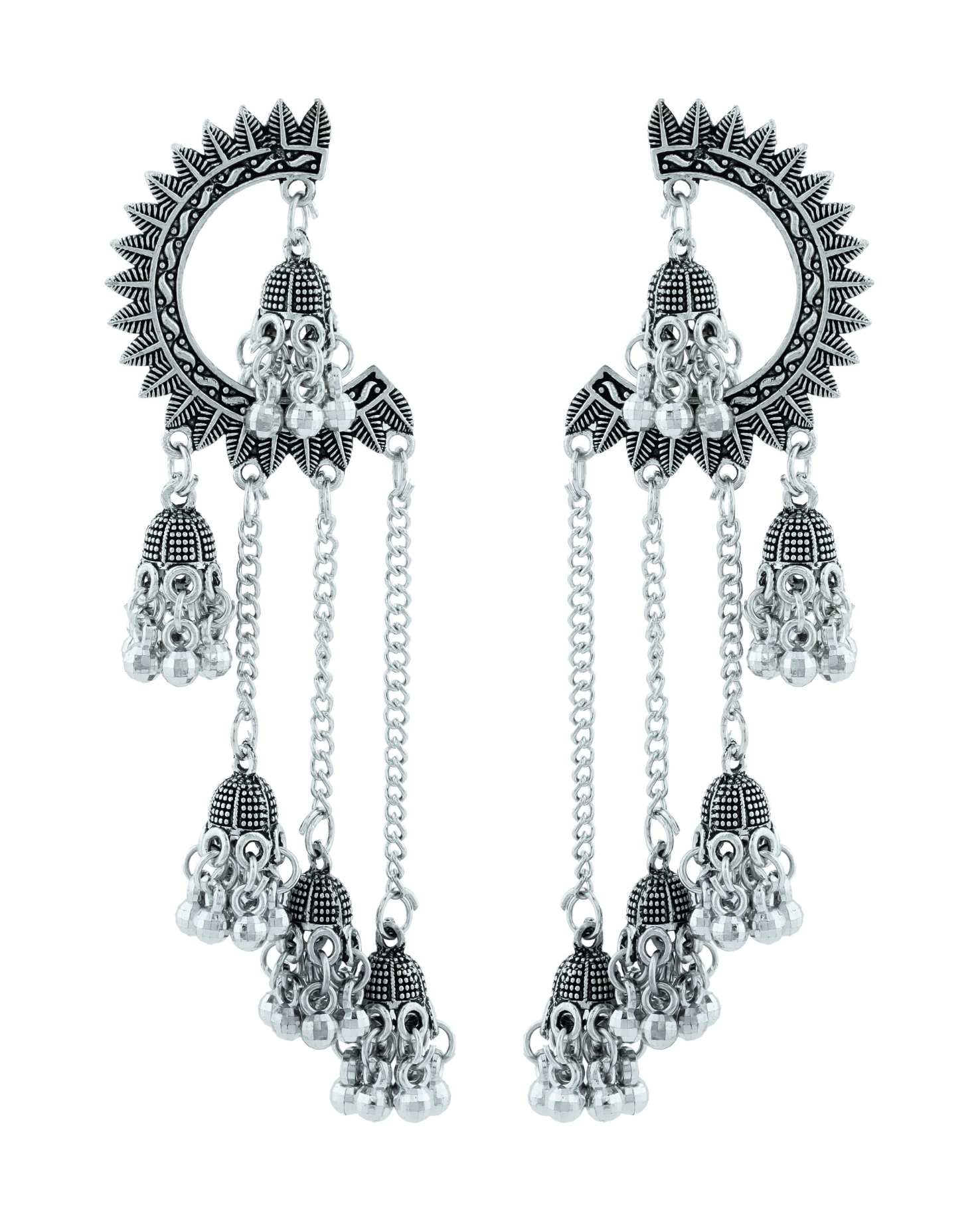 Graceful and intricately designed, the Taisha Long Silver Jhumka is a perfect blend of tradition and elegance. With its elongated silhouette and fine craftsmanship, this piece adds a regal charm to your ensemble. A must-have for lovers of statement jewellery.