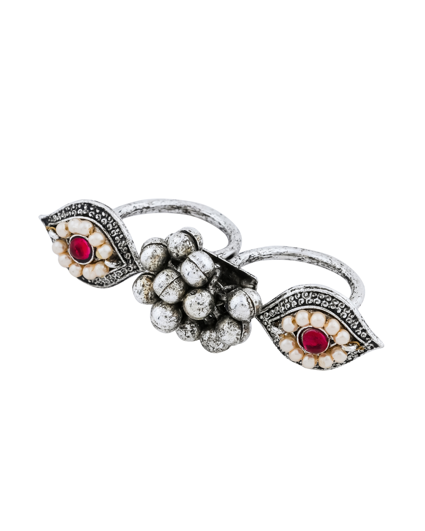 Urvi Adjustable Ring: With small bells in between adorned with pink stones surrounded by pearls is pure beauty.
